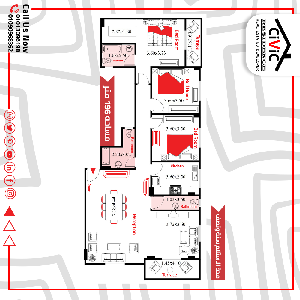 مساحة الشقة الاجمالية 196متر مربع وتتقسم لعدد 3 غرفة نوم و 3 حمام و 3 ريسيبشن.